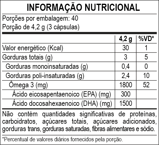 Óleo de peixe. Composição da cápsula: gelatina, água purificada e umectante glicerina. CONTÉM GLÚTEN. ALÉRGICOS: CONTÉM DERIVADOS DE PEIXE.