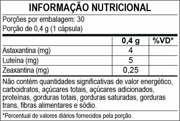 Luteína da flor de tagetes erecta, ésteres de astaxantina de haematococcus pluvialis, zeaxantina. Agente de massa: amido de milho, antiumectantes: dióxido de silício e estearato de magnésio. Composição da cápsula: gelatina, corante: dióxido de titânio (INS 171). NÃO CONTÉM GLÚTEN.