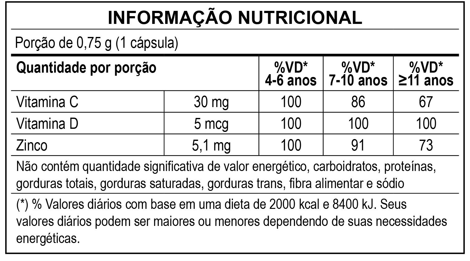 Óleo de coco, lactose, carbonato de cálcio, ascorbato de cálcio, óleo de girassol, óxido de zinco, colecalciferol, edulcorantes xarope de maltitol, xilitol e sucralose, glaceante cera de abelha, emulsificante lecitina de girassol, acidulante ácido cítrico, óleo essencial de laranja e aroma de frutas silvestres. Composição da cápsula: gelatina, amido modificado, água purificada, umectante glicerina, edulcorante sucralose, aroma de frutas silvestres e corante natural carmim e óxido de ferro amarelo. NÃO CONTÉM GLÚTEN. ALÉRGICOS: CONTÉM DERIVADOS DE LEITE.