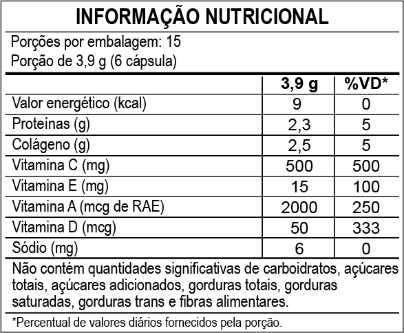Peptídeos bioativos de colágeno hidrolisado com peso molecular médio de 2kDa (Verisol®), vitamina C (ácido ascórbico), vitamina E (acetato de tocoferol), vitamina A (acetato de retinol), vitamina D (colecalciferol), antiumectantes: dióxido de silício e estearato de magnésio. Composição da cápsula: gelatina e corante dióxido de titânio (INS 171). NÃO CONTÉM GLÚTEN.