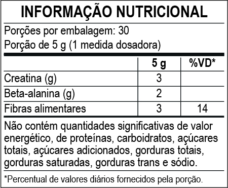 Creatina Monohidratada, beta alanina. NÃO CONTÉM GLÚTEN.