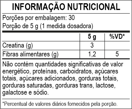 Creatina Monohidratada. Agente de massa: polidextrose, aroma idêntico ao natural de laranja, acidulante: ácido cítrico, corante natural de urucum, antiumectantes: fosfato tricálcico, dióxido de silício, edulcorante: sucralose. NÃO CONTÉM GLÚTEN.