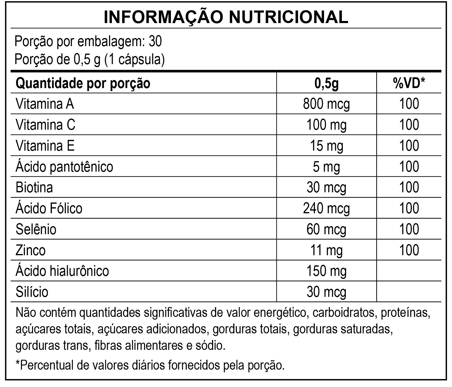 Hialuronato de sódio obtido pela fermentação de Streptococcus zooepidemicus, ácido ascórbico (vitamina C), bisglicinato de zinco, vitamina E acetato, ácido ortosilícico estabilizado em cloreto de colina, ácido pantotênico (vitamina B5), acetato de retinol (vitamina A), selenometionina, ácido fólico (vitamina B9), biotina (vitamina H). Agente de massa: celulose microcristalina, antiumectantes: dióxido de silício e estearato de magnésio. Composição da cápsula: gelatina, corantes: dióxido de titânio (INS 171), azul brilhante (INS 133), eritrosina (INS 127). NÃO CONTÉM GLÚTEN.