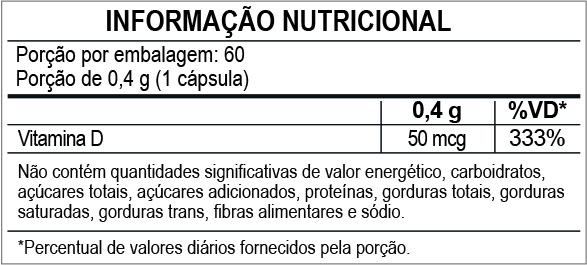 Colecalciferol (vitamina D). Agente de massa: amido de milho, antiumectantes: dióxido de silício e estearato de magnésio. Composição da cápsula: gelatina, corante: dióxido de titânio (INS 171). NÃO CONTÉM GLÚTEN.