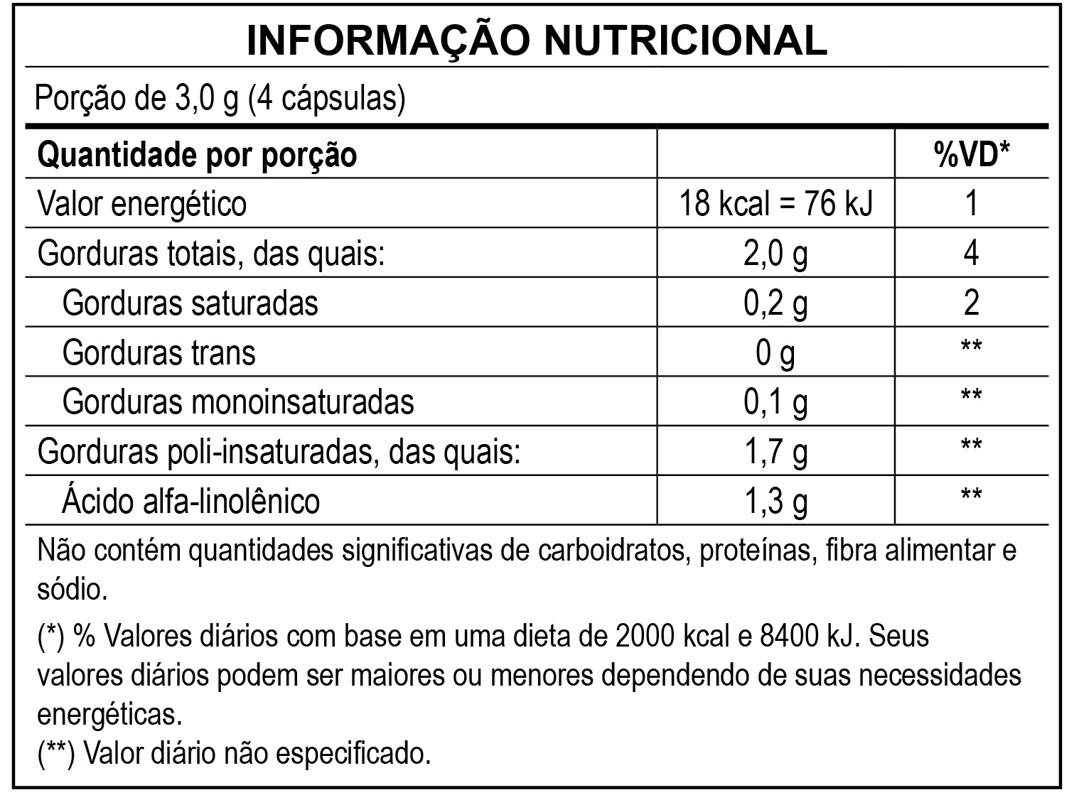 Óleo de semente chia. Composição da cápsula: gelatina, água purificada e umectante glicerina. NÃO CONTÉM GLÚTEN.