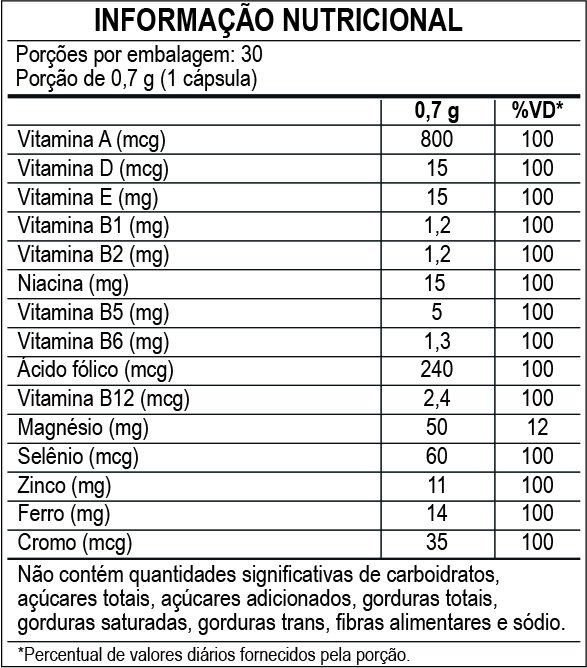 Bisglicinato de magnésio, bisglicinato de ferro, bisglicinato de zinco, acetato de tocoferol (vitamina E), niacina (vitamina B3), ácido pantotênico (vitamina B5), piridoxina (vitamina B6), riboflavina (vitamina B2), tiamina (vitamina B1), acetato de retinol (vitamina A), ácido fólico (vitamina B9), seleniometionina, picolinato de cromo, biotina, colecalciferol (vitamina D), cianocobalamina (vitamina B12). Agente de massa: celulose microcristalina, antiumectantes: dióxido de silício e estearato de magnésio. Composição da cápsula: gelatina, corante: dióxido de titânio (INS 171). NÃO CONTÉM GLÚTEN.